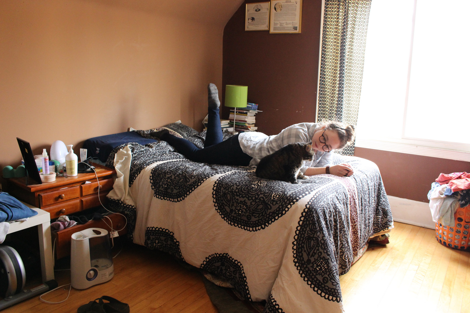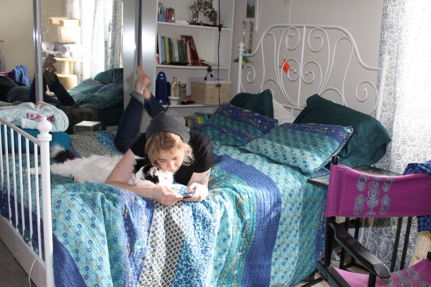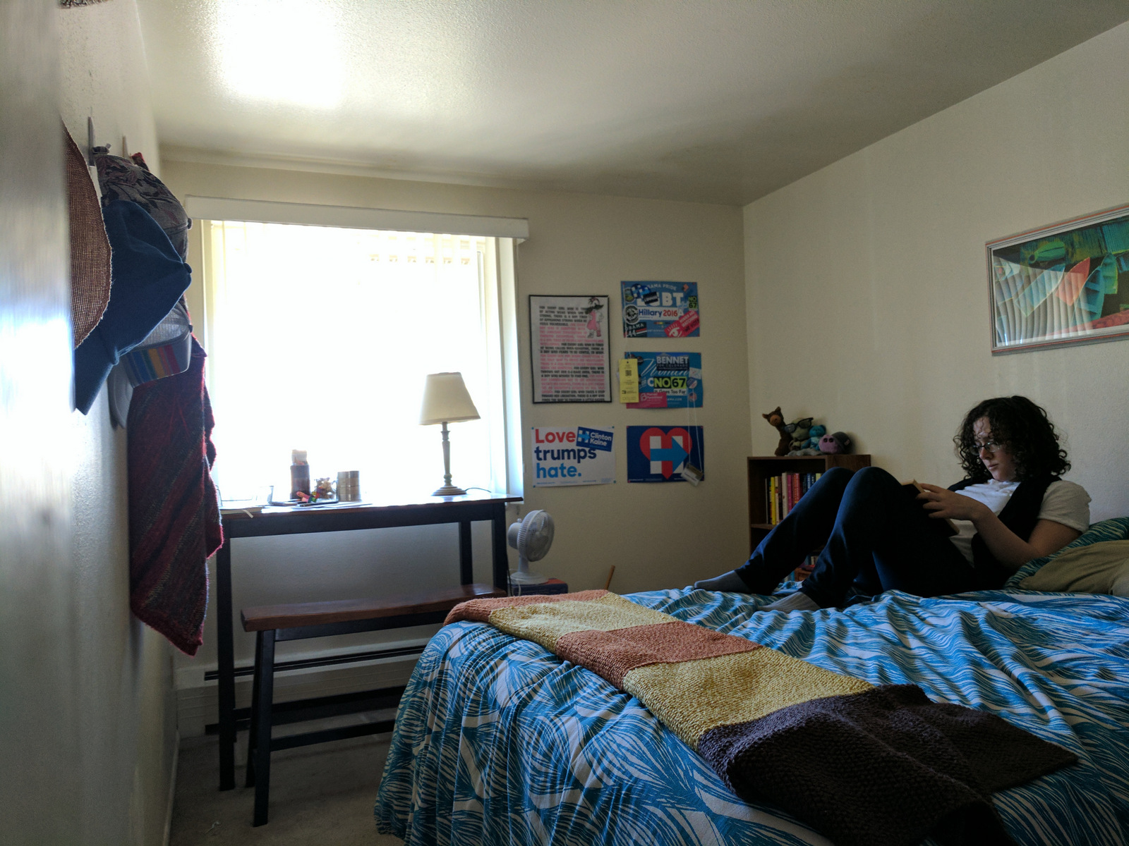 “I moved here in December, and today I left my windows open for the first time, and that was pretty exciting. I bought the plants on my windowsill a few weeks ago, and I haven’t killed them yet. It’s starting to feel like home.”