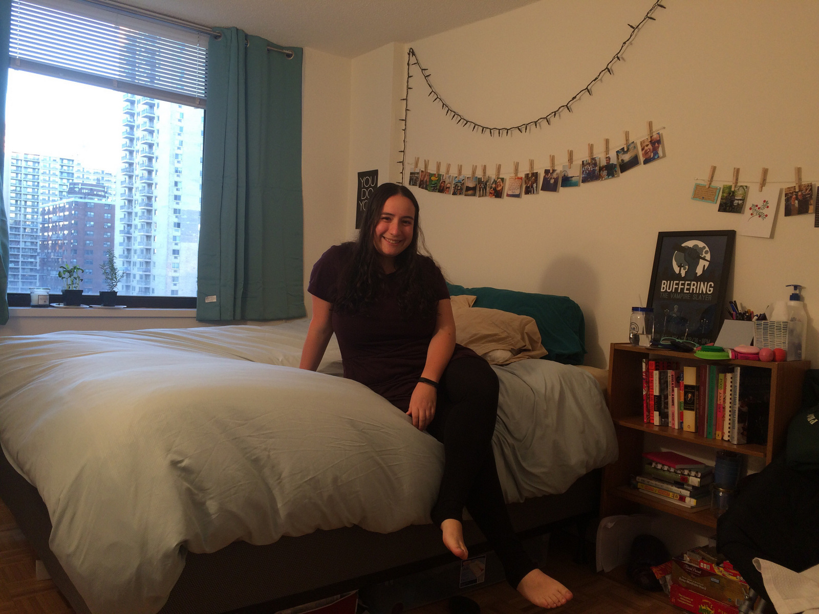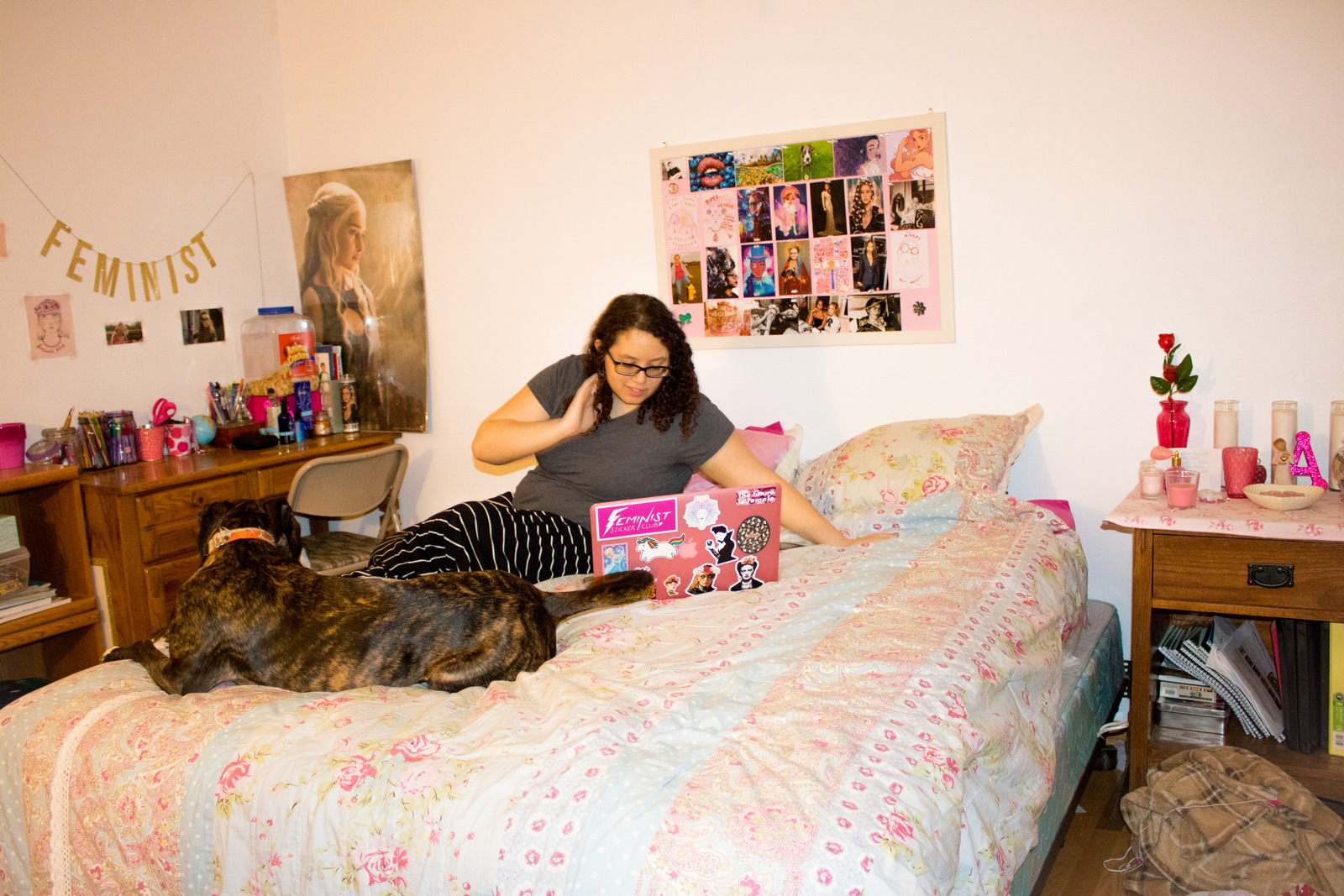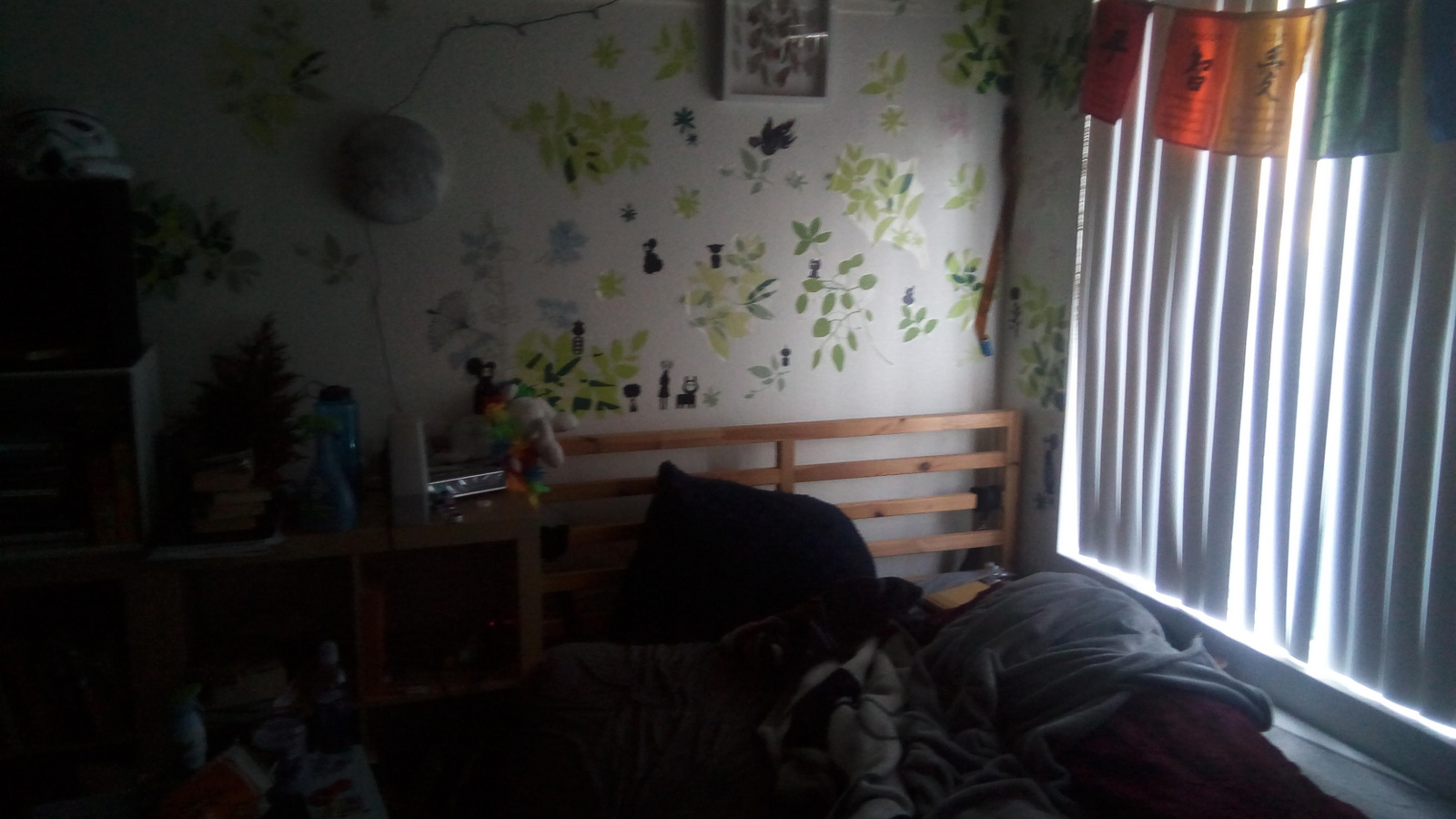 “I have lived in this room for approximately one month and think it is coming along nicely. I wake up in the morning with Addy (my dog) licking me so I take her outside. At night time Addy and I cuddle and watch documentaries until we fall asleep. Some of my favorite things in my room: My Aphrodite altar, umm the bed of course, and my dog Addy.”