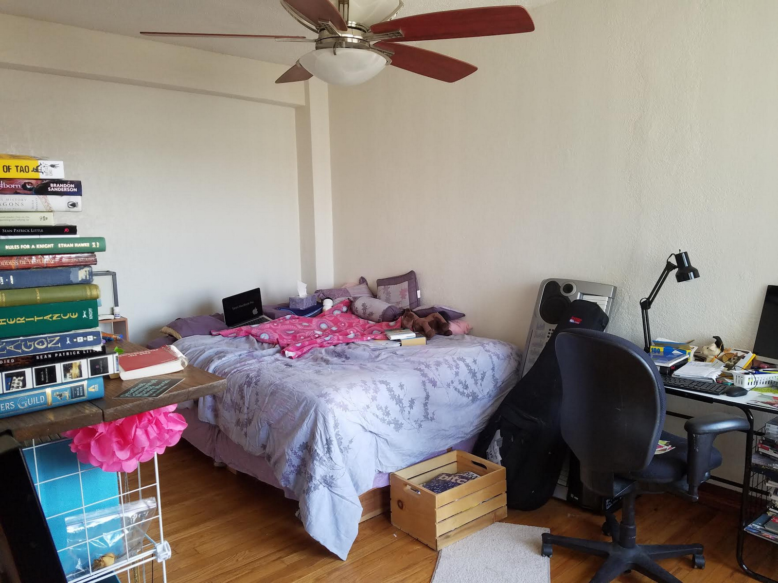 “I love this bedroom because it is the first one my fiancée (not pictured) and I decorated together. It’s spacious, quiet, and serene even in the middle of the city, with lots of light, and the books represent an wonderful mix of our interests.”