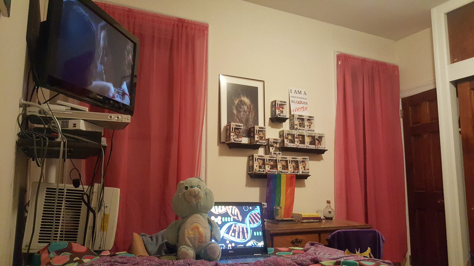 “My room is literally always a mess (I cleaned for you… sorry about the AC/wires) but it’s home. I feel comfortable in the chaos. I know you can’t really see my bed (just my mermaid blanket and Wishbear) but this is where I’m usually sitting when I’m in my room, writing or watching TV, and I love my nerdwall in all its glory.”