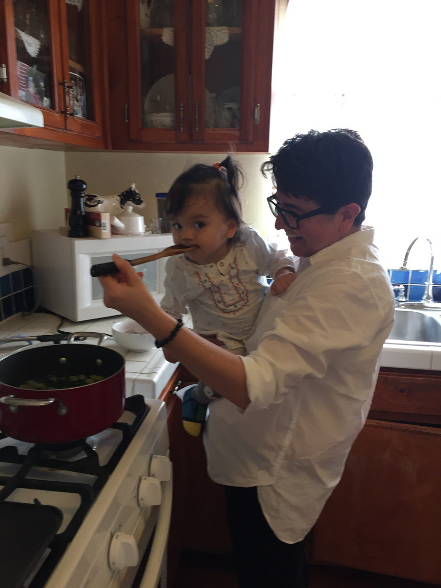 “My kitchen isn’t fancy; it isn’t even that clean, but it is where everyone ends up when my family comes over, and there isn’t even any seating. My favorite thing about it is the picture of my father taken in this kitchen as he was skewering meat for a carne asada, and a picture of me shortly after he died doing the same. This picture is of me letting my niece taste the soup I made her for seasoning.”