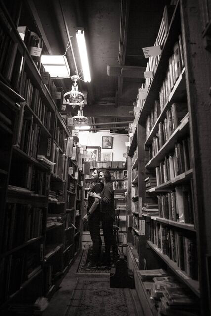 “We live in a commune with ten friends, so our bookshelf holds everyone’s books. The shelves themselves were built by a friend of ours. The right shelf is fiction and the left shelf is nonfiction organized by topic. When we moved house last year, we packed the books into twenty-eight boxes (!), and the friends who helped us move were pretty pissed when we started unpacking and they realized that most of the boxes we’d lugged all day contained books.
