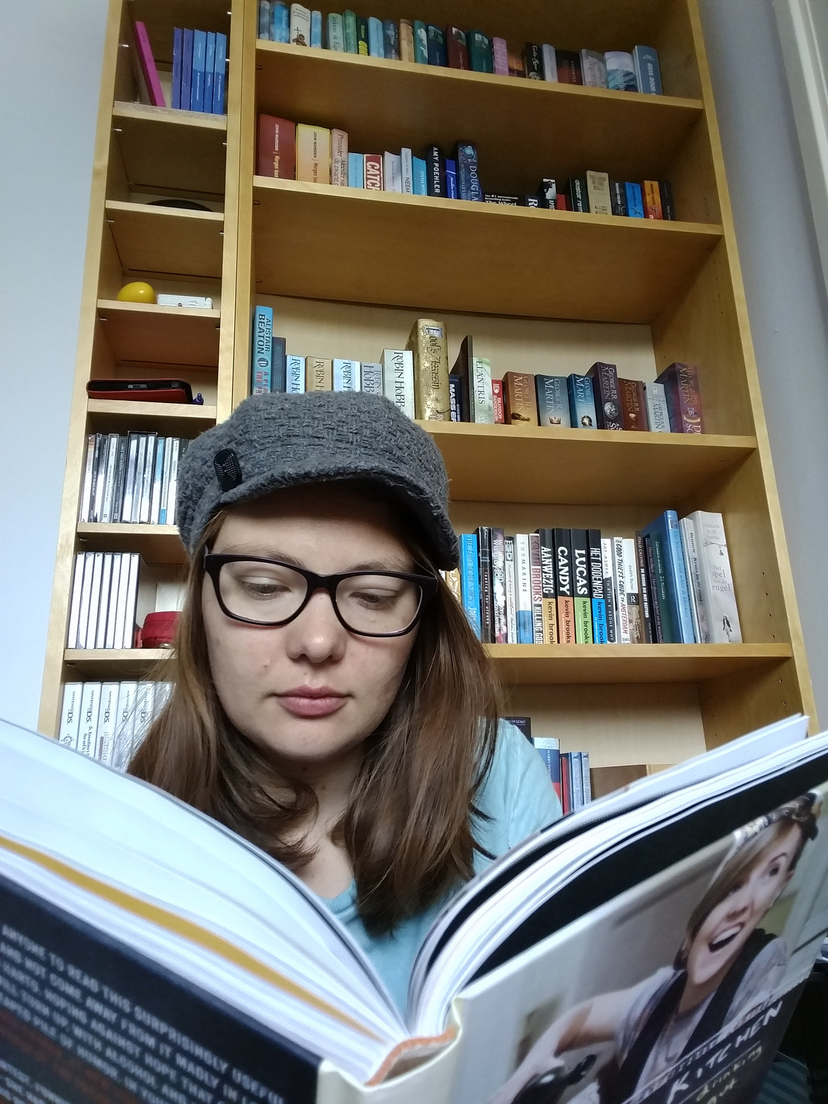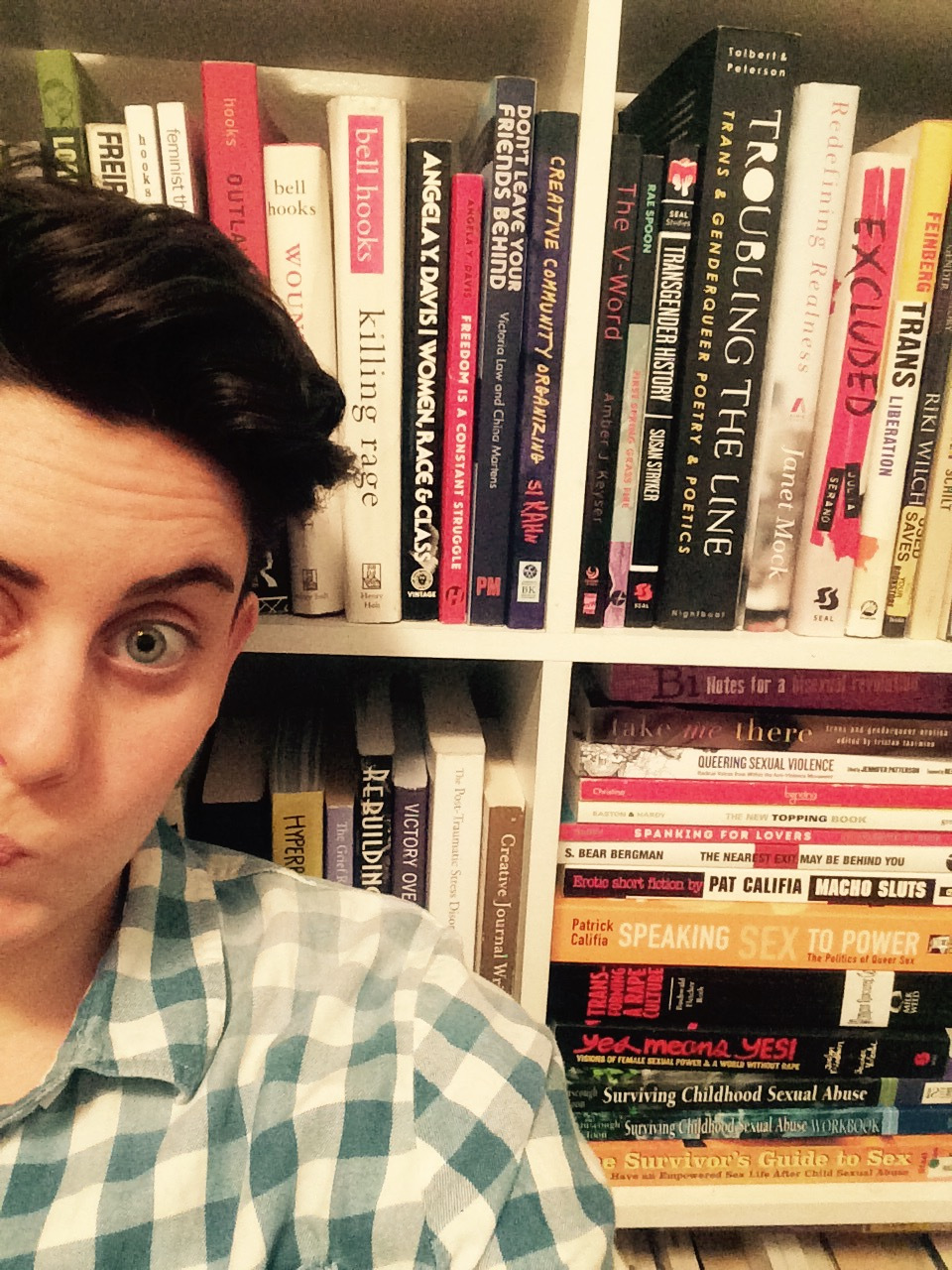 “When I moved into my house I couldn’t feasibly take my large bookcase with me. I currently have 3 small shelves that house my books, with the bookshelf pictured being the most recent addition. This bookshelf is my favorite because not only does it fit the majority of my books, but my cat can lounge on it and spy on the neighbors (cat not pictured — she was too cool to take a selfie with her mom). Half of the shelf is devoted to my queer book collection, which I began in 2000 with Tipping the Velvet. I used to organize my books by subject, then by author (an author with multiple books was then organized by publication date). I wasn’t as detailed with this new bookshelf, but I did separate queer from non-queer! My favorite book is Fall on Your Knees by Ann Marie MacDonald. It has traveled from home, to college, to the U.K., and back again. As much as I love my Kindle, nothing compares to the beauty of books.”