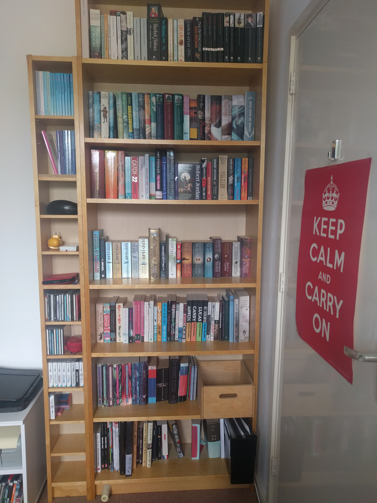 “I wouldn’t call my books strictly organized. There’s some books that I didn’t know where to put, so the Hitchhikers’s Guide to the Galaxy is hanging out next to a book named The Confused Guinea Pig. Roughly, the sections are English literature, beloved (Dutch) books from my childhood, sci-fi/fantasy, YA novels, Harry Potter, and on the final shelf there’s some comics. The Green Flower trilogy is my favourite thing on these shelves probably. It’s the coming-of-age/coming-out story of a 16-year-old boy in Victorian London, during the time of Oscar Wilde’s trial. My second favourite thing are my Hawkeye comics. Last year I wondered if I had lost the joy in reading, but since then I’ve discovered that I just needed to get my hands on fantasy novels with queer characters in them.