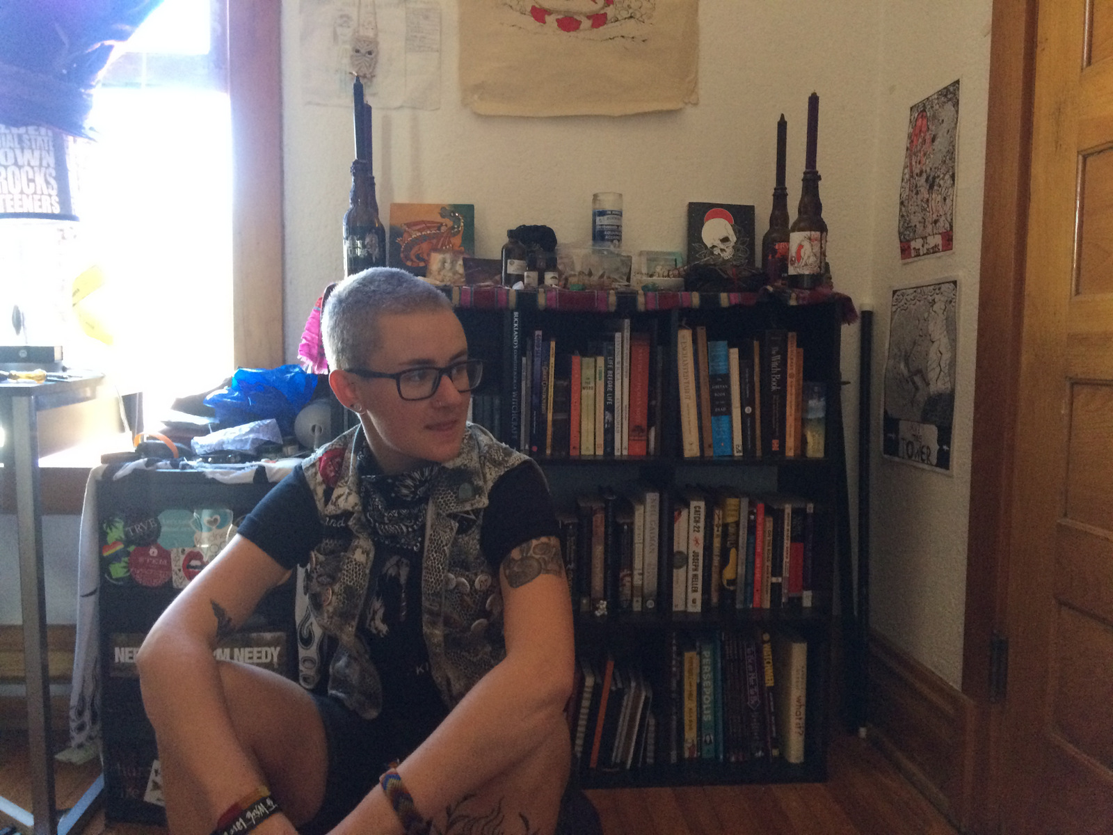 “I’m a writer, and my book collection is my pride and joy. I actually just rearranged my bookshelves yesterday, as an antidote to a bad mental health day. I find books so soothing, just their physical presence. I guess I kind of organize my books like a bookstore, which is where I spent most of my time growing up– there wasn’t much to do in my suburb besides putz around the local corporate book chain. Left to right, top to bottom, this one’s got tapes and CDs, philosophy, spirituality and metaphysics, prose fiction, old journals, and comics/graphic novels. The top also doubles as a witchy altar space, full of my equally beloved stones and candles and such, and I guess the whole shelf is part of the altar; I believe that books are sacred, and more than that that stories and words hold unbelievable power and sanctity. There’s another one out of frame to the left that has poetry and the rest. I’m pretty proud of my poetry collection, but this shelf made a better photo, so here we are. My favorite book that’s somewhere in this photo is Neil Gaiman’s and Terry Pratchett’s sublime collaborative comedy novel about Armageddon, Good Omens. I just finished a book of selected poems by H.D. though and I’m falling madly in love with her all over again.”