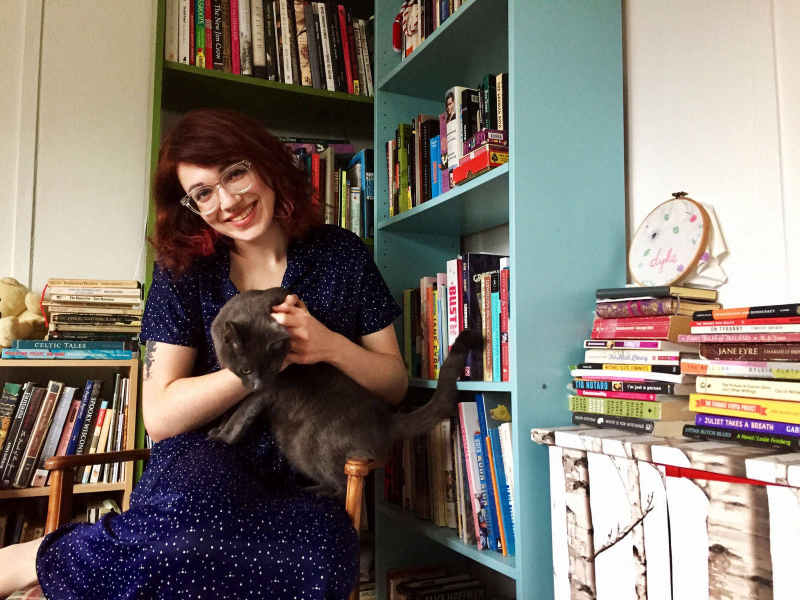 “The blue bookshelf was, at one point, organized in order of lesbianism (including lesbian pulp fiction, queer theory, cat books, witchy books, etc.). Other than that, my books are roughly organized into the following categories: summer reading, dystopian “fiction,” memoir/biography, self-help & trauma, fairy tales, travel books, poetry, books by old/dead white guys that I probably had to buy for a class.