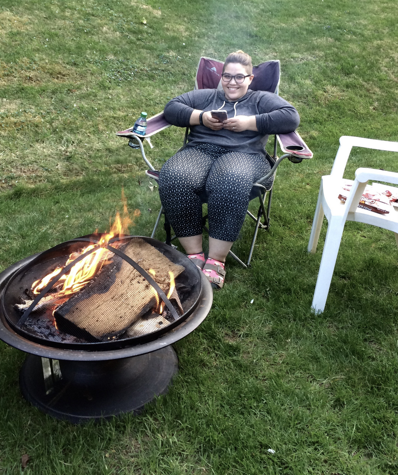 “In this charming photo that my dad snapped, I’m sitting alone by our fire pit, wearing s’mores socks and knock-off Birkenstocks, and waiting for my high school friends to come over and catch up.”