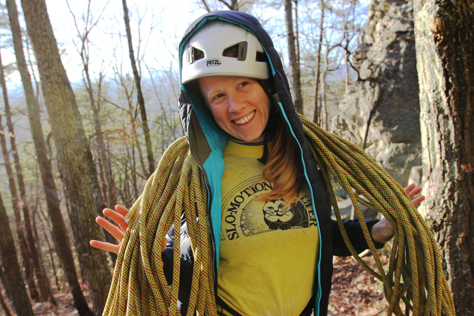 “Beth wrangles a rope after rock climbing at Pilot Mountain in central North Carolina.”