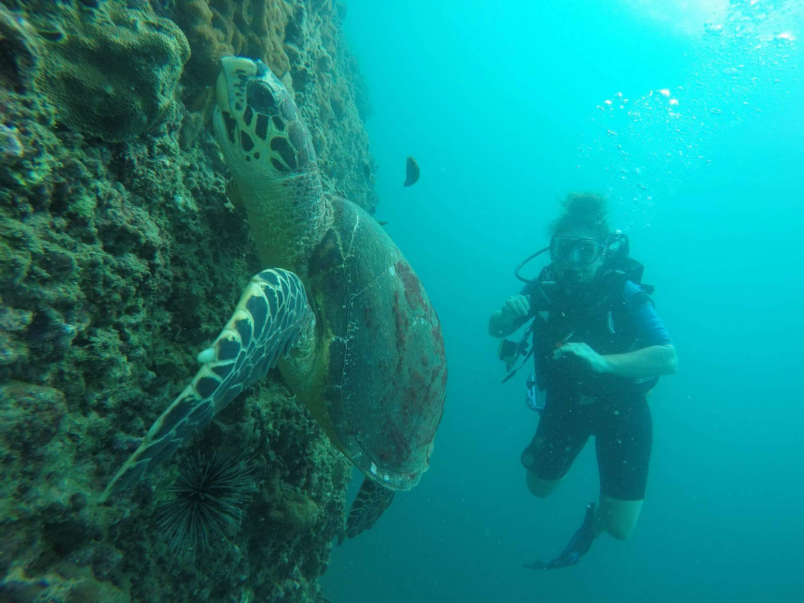 “This was a beautiful moment in which I’m swimming along normally and all of a sudden, I see this incredibly cute turtle eating weird bubble things on the ocean floor! My first turtle I’ve ever seen! Yahoo!”
