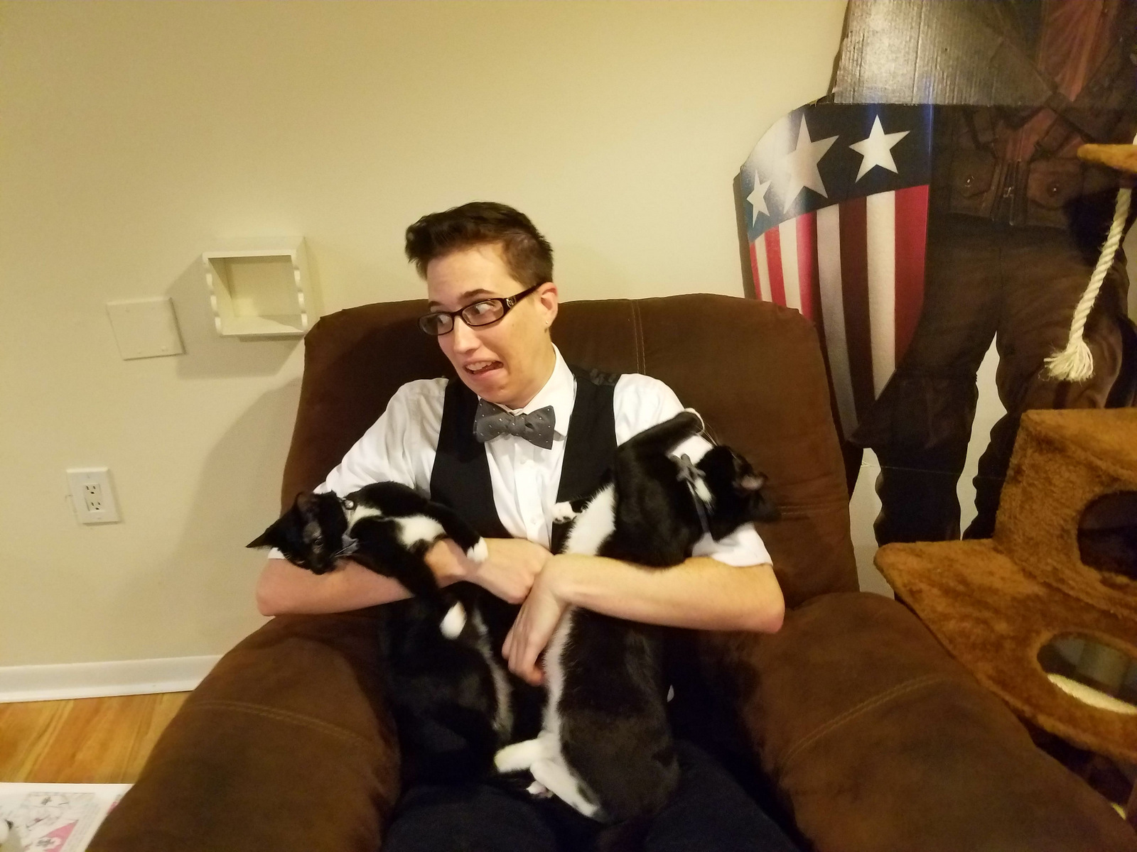 “These two goobers were found on one of the train cars at my work, they were barely a day old and we think their mom missed the ride to the repair shop. Luckily my boss let me watch them/feed them at my desk until they were old enough to stay at home. Beau is an aggressive cuddler. Arrow is recklessly brave. Seven months ago they fit in one hand and now look them!”