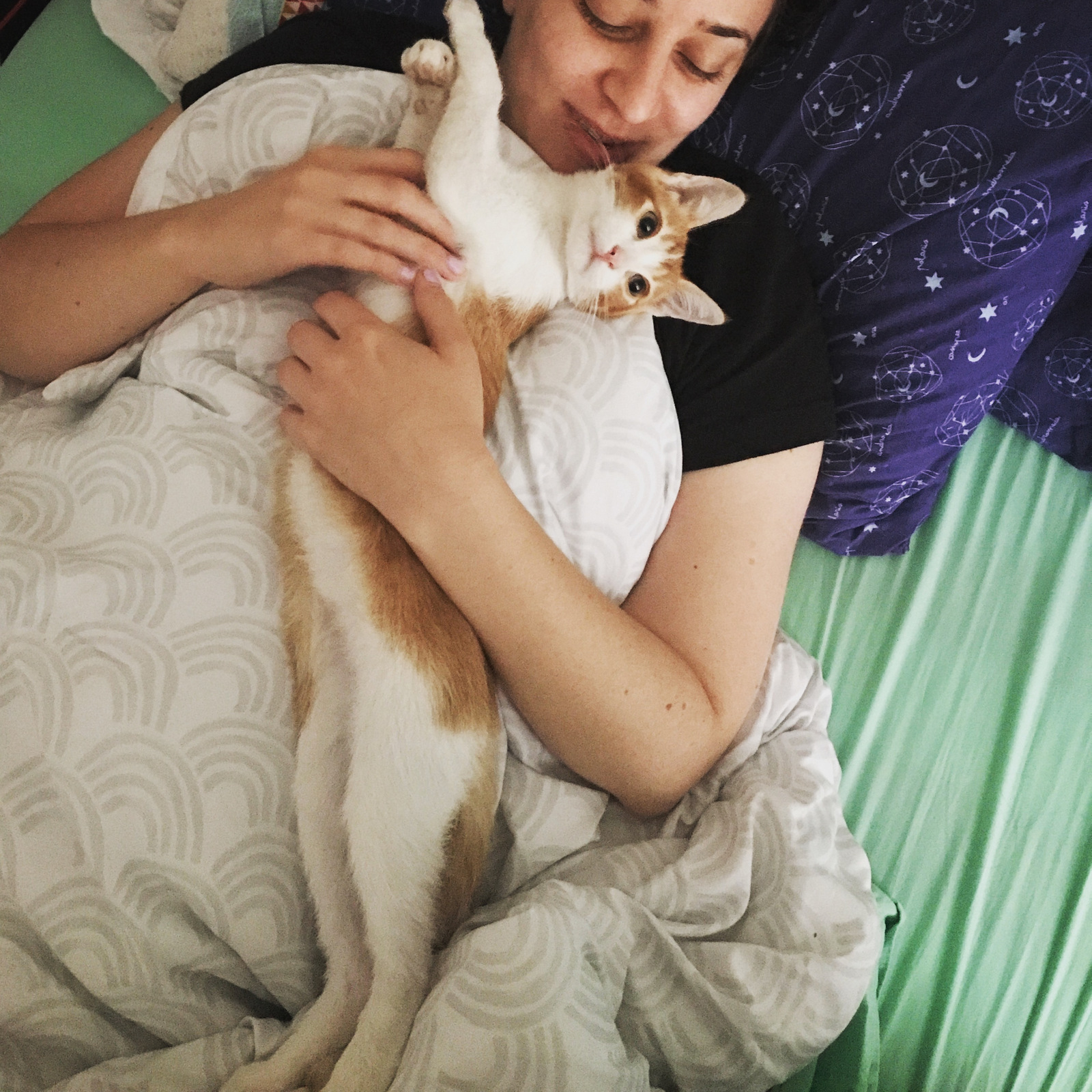 “I had wanted a cat for a while and finally decided to take the plunge. I met Cheddar at the local SPCA and he definitely picked me. He looked right at me, walked over to the window, and I knew he was the one. I had picked out several names before I went to adopt a cat, and Cheddar was on the list if I ended up with an orange kitty. It seemed to fit him perfectly. The best thing about him is how much personality he has. He’s silly, full of energy, and does the funniest things — currently, he’s obsessed with playing with ice cubes. He brings a lot of joy to my life and helps remind me that even when bad things happen (like him throwing up or breaking something), I can handle it.”