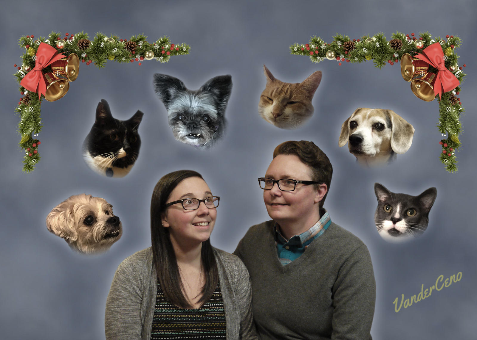 Also attached: Our 2016 Christmas card. From left to right: Teddy, Bo, Mogwai, Mister, Rosie (may she rest in peace), and Detective Olivia Benson (may she also rest in peace; 2017 has been a shit year!).”
