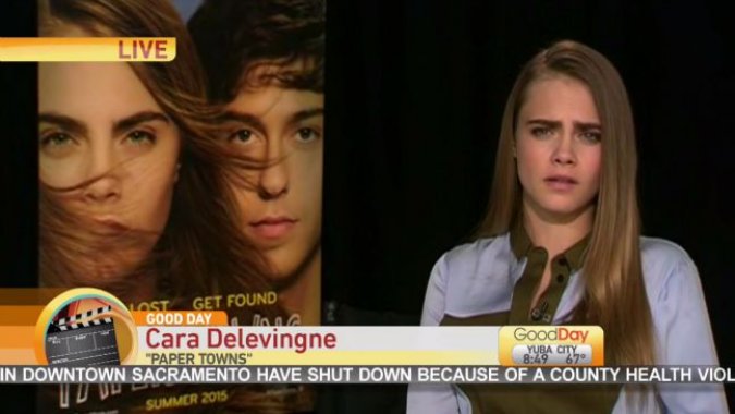 Cara Delevingne went on Good Morning Sacramento to promote Paper Towns and the news anchors were so horrible it took me like 15 minutes to watch this whole clip. They told her to go “take a little nap.” And then when her satellite feed was gone, one of the guys was like, “She was in a mood!” Between this and that Vogue guy mansplaining her bisexuality to her, I wouldn’t blame her for never doing another interview again! Anyway, here’s the clip; prepare to be bamboozled.