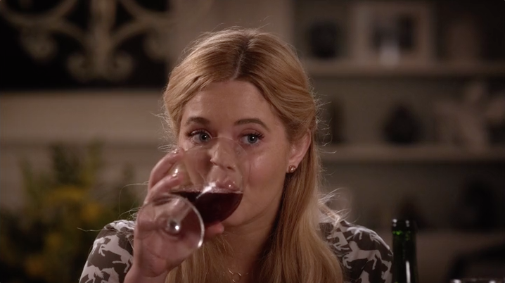 Ali has decided to host a dinner for her friends to suss out which one of them murdered her sister. It’s marvelous, actually. A total Ali move from the days of yore. She says the most passive aggressive pre-meal prayer I have ever heard in my life, seeking Jesus’ council and protection as she roots out the traitor in her midst, quoting various versus from Leviticus about the punishments she is entitled to rain down on the person who betrayed her. But it’s not all vengeance and bloodlust! Everyone gets to meet Jordan for the first time, and it goes just fine. I mean, he bosses Caleb around enough to agitate Spencer — who may or may not have made sweet Ravenclaw love to him on a train in Madrid, years ago after their eyes met across the platform and she was but a lonely scholar and he was a reverted hobo — but mostly everyone’s just thankful Jordan brought a bevy load of booze to share with the group.
