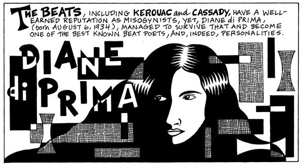 Which, on one level, is inspiring. It’s as if all those wordless, exotic, eternally obliging girls in the Kerouac novels stepped out of the background and started talking. You can point to Diane Di Prima, if you want to prove something. You can say, see? There were women there, after all! Here’s the woman!