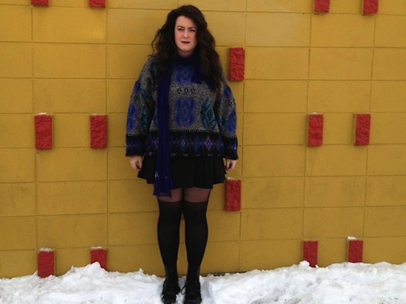 Still, when that big snow storm hits you might be tempted to just grab your thickest fleece lined leggings, slouchy hat, a V-neck sweater and your huge winter boots. Just like you do every storm. Instead I implore you to take the opportunity to layer up! Throw a funky pattern sweater over a dress over shorts over thigh-high stockings over nylons for layers and layers of cuteness and warmth.