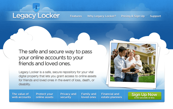 Legacy Locker accounts store your usernames and passwords for any website to be assigned to your beneficiaries. The site requires you to designate at least two trusted people as “verifiers” who should have access to your official legal documentation, such as your death certificate, so that they can confirm that your assets should be released. It also provides a “Legacy Letters” service which delivers notes electronically to friends, loved ones or colleagues, as well as document backup and video upload services for a fee.