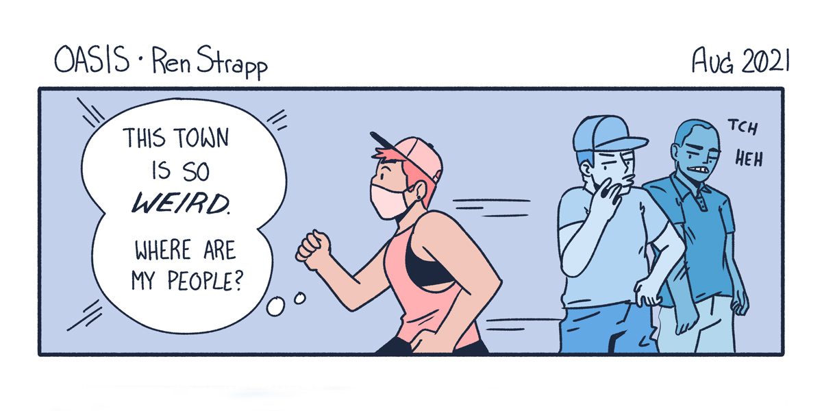 Ren Strapp is a comic artist, designer, and gender nonconforming lesbian werewolf. She grew up in Susquehannock territory and now lives on unceded land at the confluence of the Wimahl and Willamette rivers. Ren started her comics career in zines and web comics and will be a zinester until she dies. Her work is inspired by risograph printing and American traditional tattooing. She is currently working on a college-aged graphic novel (How Could You, Oni Press 2024). She loves weight lifting and hiking. Support her work on Patreon.