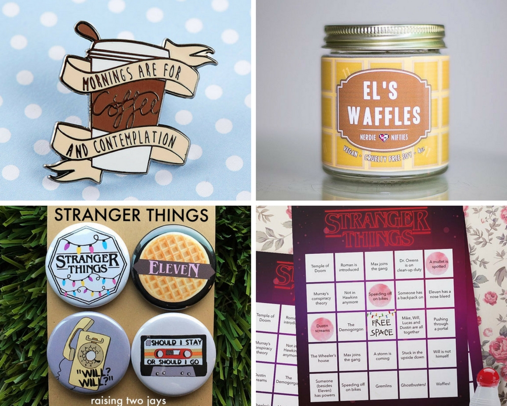 Mornings are for Coffee and Contemplation pin, $9.64. Waffle scented candle, $6.99. Four-pack of Stranger Things pins, $5.26. Bingo card digital download, $5 (you know, if you’re throwing a viewing party to which you’d like to invite me).