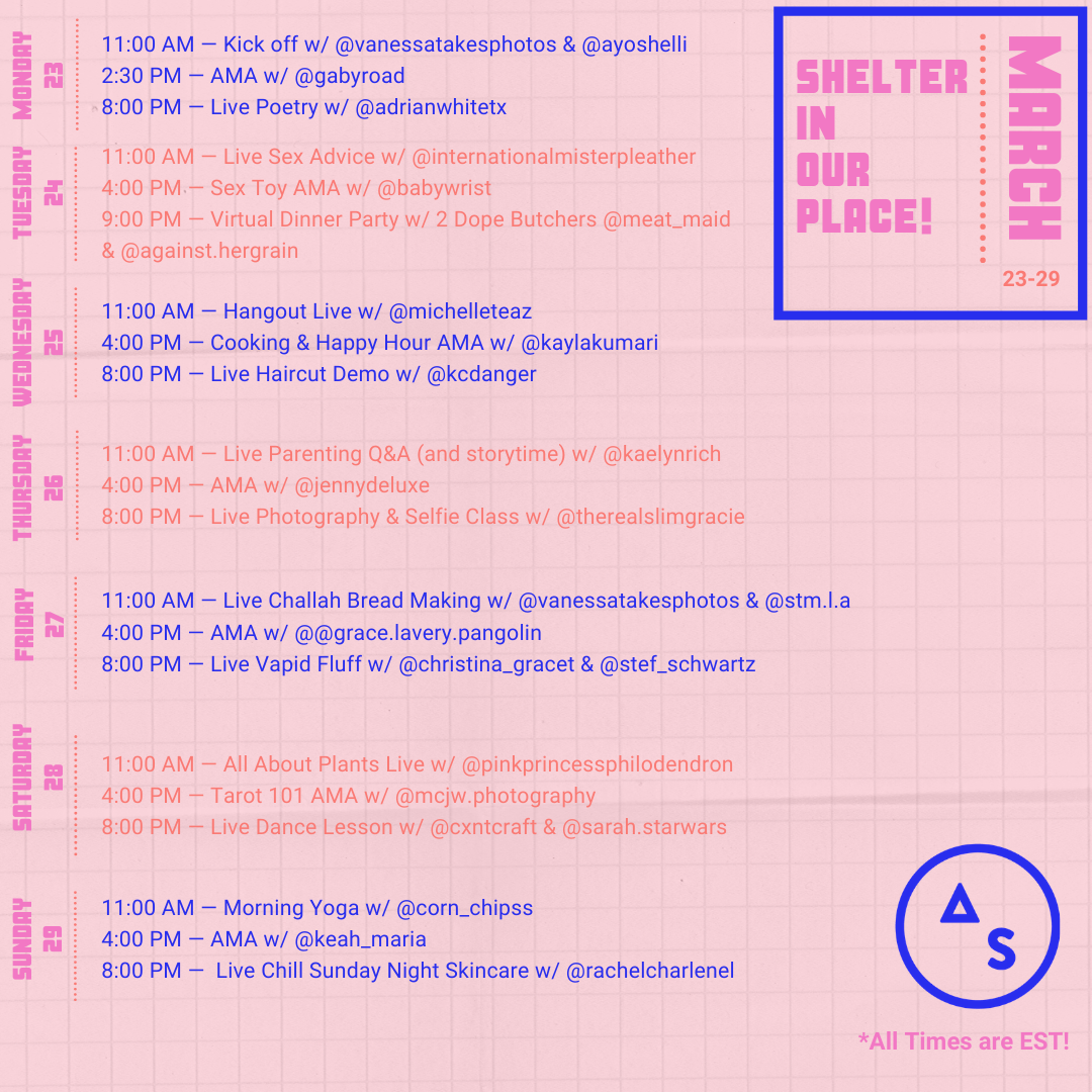 Shelter In Our Place will happen entirely on Instagram over the next week. From today, Monday 3/23 to Sunday 3/29 we will have a mixture of live programming and AMAs three times a day, morning, noon, and night. We pulled together an amazing group of humans to answer your questions about sex, love, parenting, plants, sex toys, life, and literally anything else you want to talk about. We have folks who are going to offer tarot readings, live sex advice, a haircut demo, and a yoga class. We’re all gonna be there together, if you wanna be, just existing together.