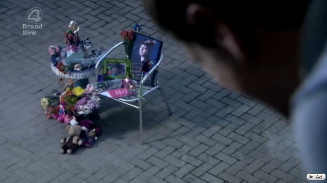 This episode’s not depressing enough and so they bring the dead girl back up, with Cook finding the police poster in his pocket. He picks up the phone to call Freddie, then changes his mind and starts dialling Effy, then realizes this is all their fault and instead stares meanly/wistfully at a poster on the wall of him and his friends before they made out with Effster.