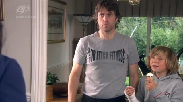 Out in the Fitch family garage, Mr. Fitch is working on his moneymaker — NO NOT THAT KIND PERVS —Â with the help of Katie’s little cross-dressing brother James and Katie’s finger-shooting boyfriend Sam. Mr. Fitch proudly introduces “the HyperFitch, a full body workout in just 5 minutes!”