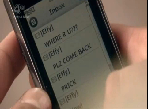He chooses the latter. Effy’s voicemail is “It is me, whoever that is. So leave whoever a message.”