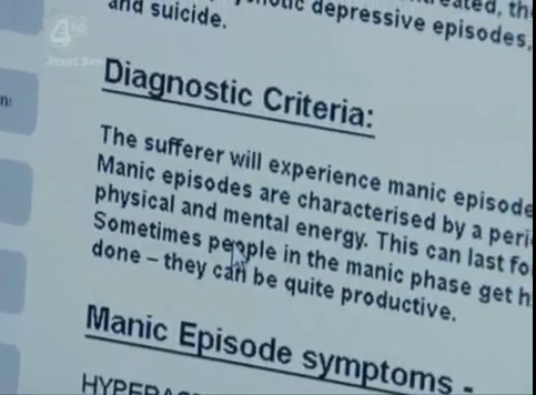 Manic Depression… Psychotic Depression. Will experience Manic episodes which will include Hyperactivity, Euphoria, Increased Sexuality, Paranoid Delusions, Reckless Behavior… and ain’t that the kicker… wondering if he’s part of the delusion, too.