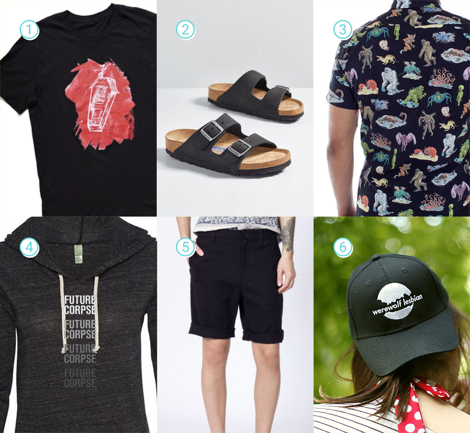 Some days, a spooky queer is less concerned with fashion and more concerned with not dropping dead from the hideous heat of the day-star. And with having sufficient pockets in which to keep chapstick, keys, small skulls, and other necessities should you have to venture outside your lair. Here are some looks that let your queer, weird self shine without compromising practicality.