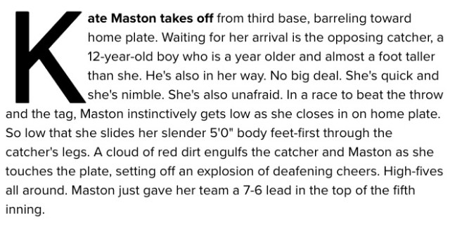 I feel you must check out this delightful and inspiring Bleacher Report article about the Girls’ Travel Baseball (GTB) teams that are taking on boys’ teams and building sisterhood and power and magic along the way.