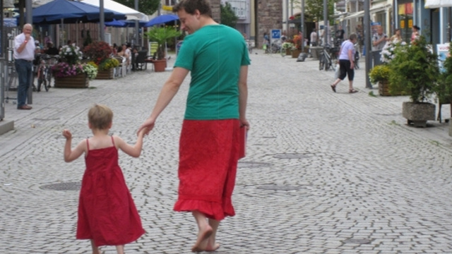 My five year old son likes to wear dresses. I didn’t want to talk my son into not wearing dresses and skirts…after a lot of contemplation I had only one option left: To broaden my shoulders for my little buddy and dress in a skirt myself…And what’s the little guy doing by now? He’s painting his fingernails. He thinks it looks pretty on my nails, too. He’s simply smiling, when other boys (and it’s nearly always boys) want to make fun of him and says: ‘You only don’t dare to wear skirts and dresses because your dads don’t dare to either.’ That’s how broad his own shoulders have become by now. And all thanks to daddy in a skirt.