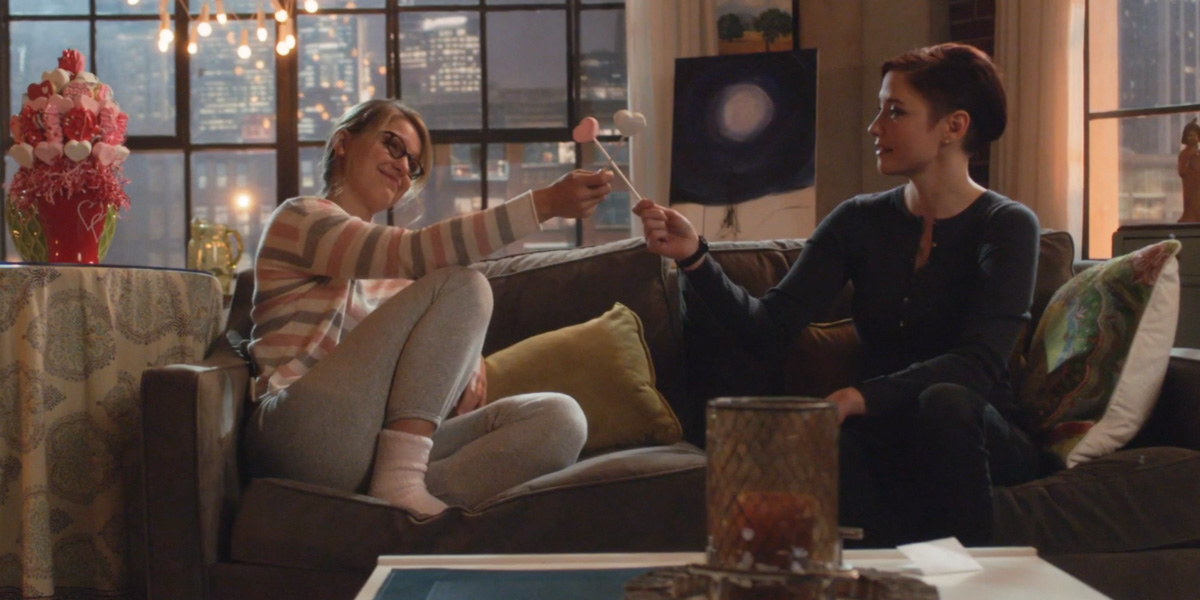 That night, Alex goes to Kara’s apartment for a debrief and to give her some discount Valentine’s candy. Alex apologizes for freaking out when she thought Kara got hurt, and admits that she needs to learn to trust that she doesn’t have to be taking care of everyone else at all times, that others can take care of themselves, and that she should be focusing a little more on herself.
