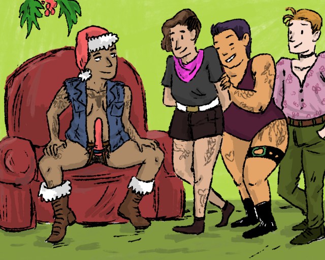 Two audacious queers sit facing each other. They fist each other with their generously-lubricated right hands while simultaneously drinking eggnog (or a dairy-free alternative) with their left hands.
