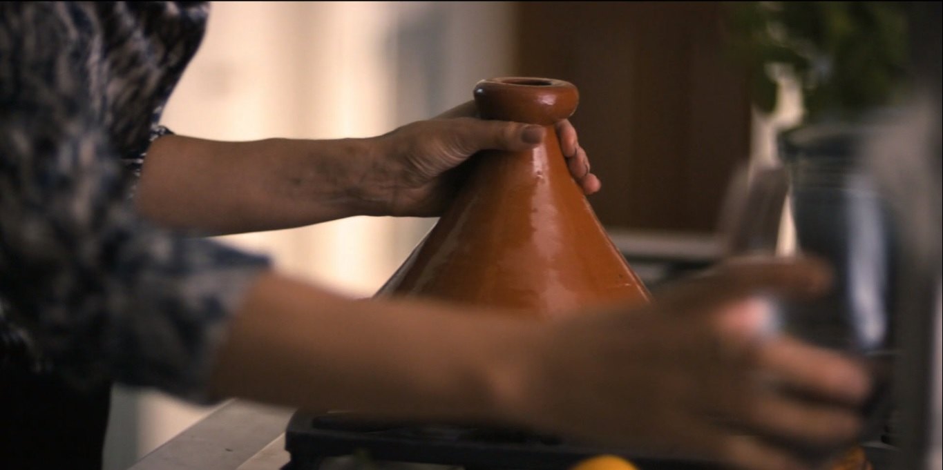 Natalie: Bette puts the lid on her tagine and goes to take a sip of wine to celebrate her culinary success.