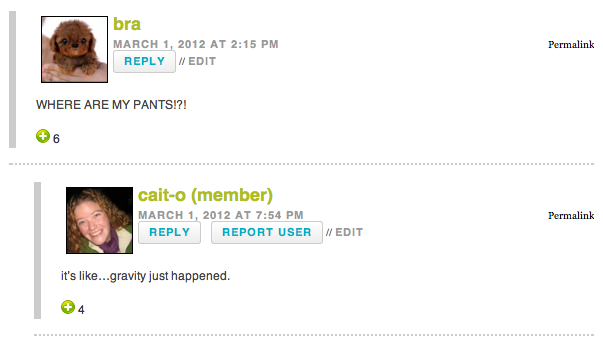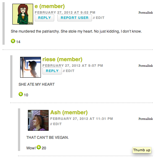 Hey champions! How did it feel to win all the awards this week? I jumped in circles of excitement around my room and listened to Brittani’s playlist a lot of times. The Oscars were on the same night and were made not only bearable but entertaining by the comedy recap stylings of our very own Lizz. Riese recapped another painful episode of Glee, DapperQ debuted He Said/We Said on Autostraddle, and Crystal brought you the weekly music fix. Whitney told you about what the Supreme Court might have to say about affirmative action, Lizz talked about boots galore, and Taylor helped you learn how to fly better. We wrapped up February with a full frontal assault of art attacks including Bex Freund, The Cunning Stunts, comics, Jenny Holzer, Tamara de Lempicka, 10 contenporary lesbian photographers, Ellis Avery, Alice Hyde, Mars Hobrecker, Michelle Muldrow, Laura Doughtie, Mira Stanic, Kathryn Weaver, Ariel Schrag, Beth Wexler, Fiona Shaw and Lizzie Spaceship. And kicked off March with a brand new calendar girl, Ness.