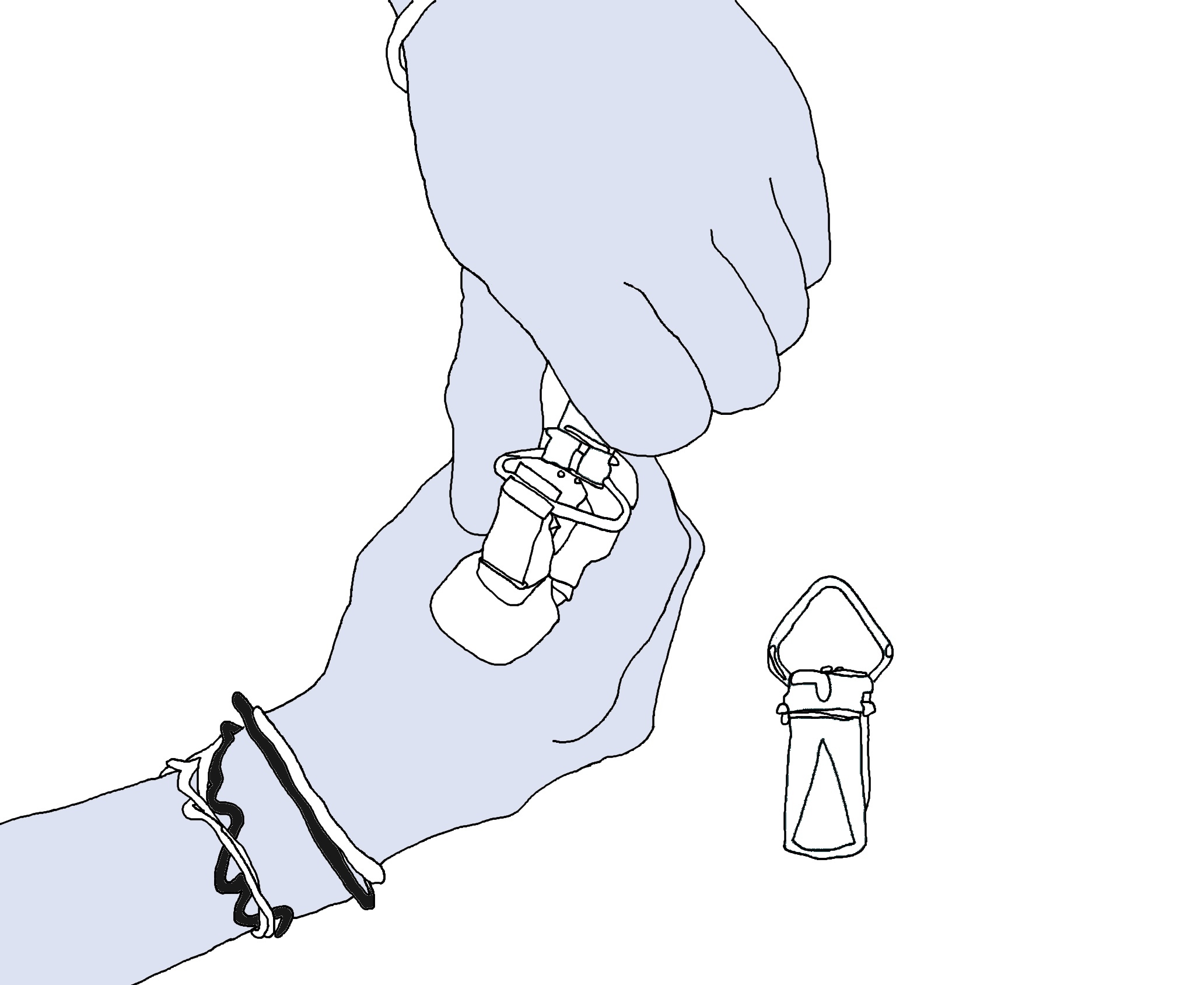 + If you bought elastic that’s thinner than an inch, you’re going to have to bend your suspender clips so that your suspenders don’t go sliding around all over the place. Using your pliers, carefully bend and pull the metal piece out until you have a triangle-shaped top. Like so: