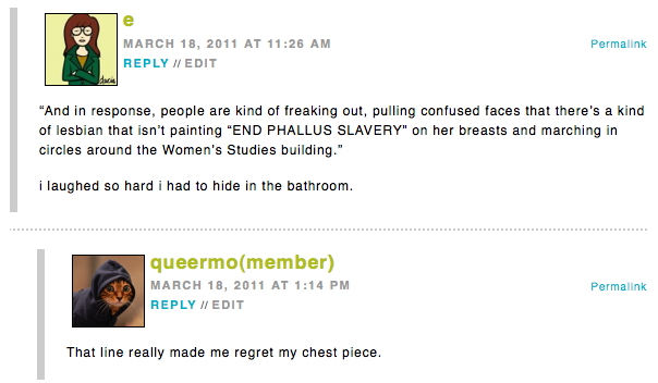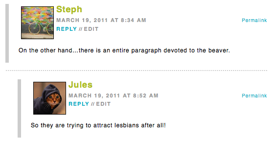 Good afternoon, sassy readers. Keep it up, we dig you all. This week we had some more poetry. The opposite of LA Fashion Week, Autostraddle Pure Poetry week is the song that doesn’t end. During this week of the week, we had Jeffrey Mcdaniel, Dorothy Porter, and Sylvia Plath. In Musicland, we had a quick conversation with Hesta Prynn and Crystal talked about 2011’s most awaited albums. No one talks on the phone to anyone but their mom anymore because we’ve all got computers, especially Miss Tech Taylor who reviewed the iPad 2. Lots of gay shit happened on teevee and Riese made jokes and an excellent headline about it. If you’re going to Dinah Shore, don’t leave without reading our packing list or reading about Amber Elizabeth who plays football and is going to be there.
