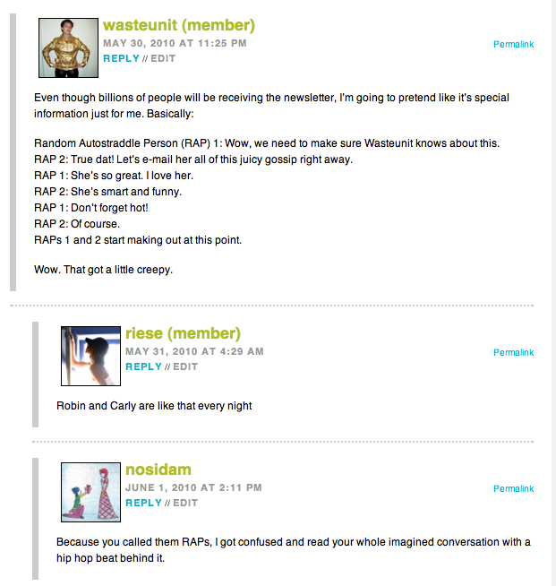 And then I registered and did it in one of my very first comments. Jesus. I feel accomplished, yet unsure of my path. Now all I have to look forward to in life is crockpot cooking and $20 off Lane Bryant coupons.