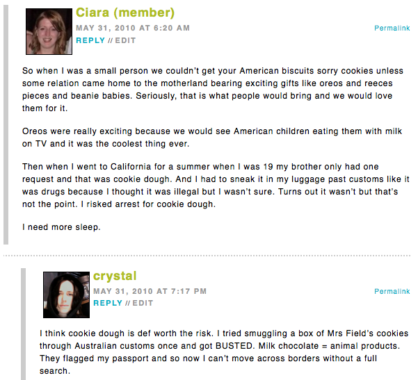 The Award for Excellence in Explanations to Katie : “Why people were more willing to comment on cookies than DADT this time around: A cookie does not require months of sitting on the Senate floor to gain enough approval to be made available to millions of people who have been waiting for it, a cookie can not sit in stagnation for months before its release (that would surely ruin its flavor), and a cookie can be enjoyed equally by anyone who decides they want it! With that being said, I am on record for eating an entire package of Milanos in under 3 minutes. My girlfriend says she can’t take me anywhere.”