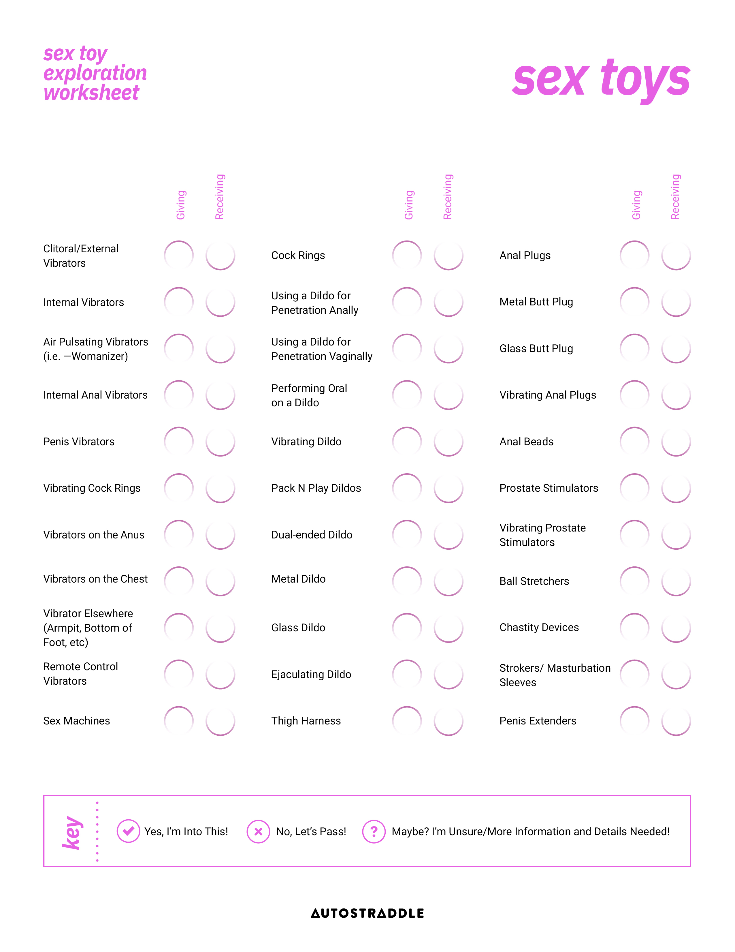 Ask them to do a Yes No Maybe list that includes various types of toys! Autostraddle’s very thorough Yes No Maybe list covers a lot of topics, but if you want something VERY specific to toys, here’s a new list! It has a list of toys and toy-centric activities you can say yes, no, or maybe to; and ALSO some fun n’ sexy brainstorming ideas for you and your partner at the end. Check it out! If you and your partner already use sex toys, this can be a good resource to introduce new types of toys into the bedroom.