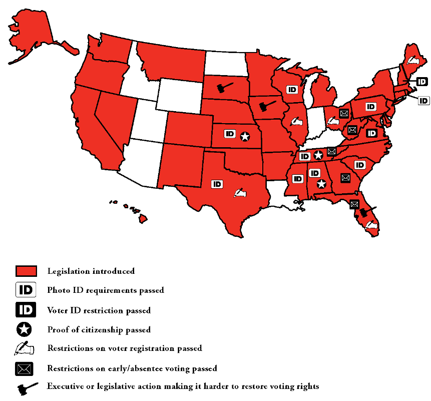 The Brennan Center also has a complete, up-to-date list of the voter legislation introduced and passed since 2011. If your state is red in the above map, check the list.