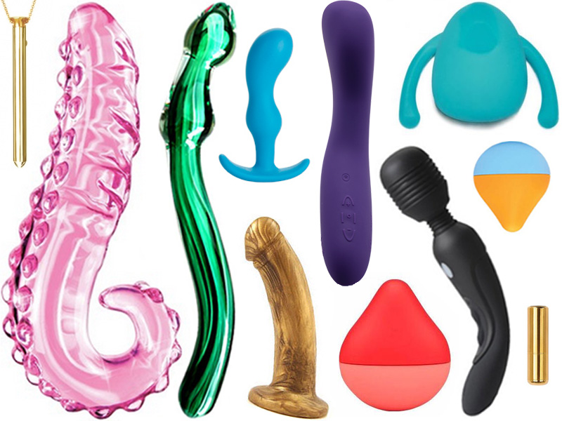Roughly clockwise: Devices of Desire pocket rocket vibrator | Cayona Vibrator | Pink Silicone Lube | Toy 5 Dildo by Wet for Her | Pink Palm Springs Wall Enamel Pin | Oh Joy Sex Toy, Volume 1, by Erika Moen | Sex Kitten Adjustable Gator Nipple Clamps | Octopussy Glass Dildo |