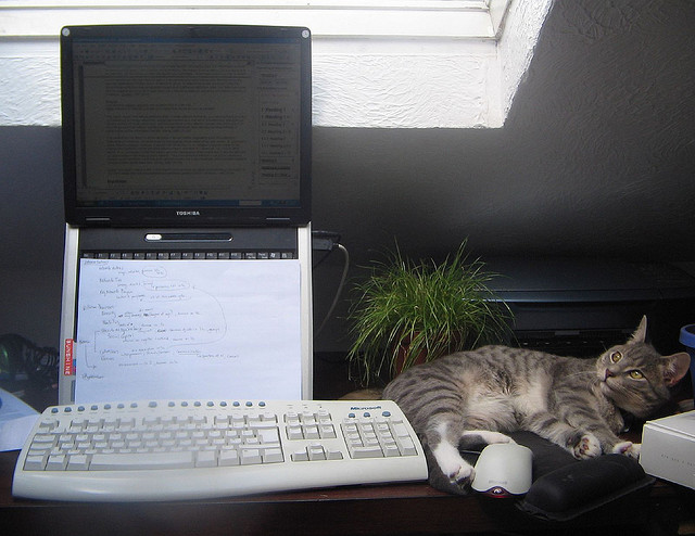 The only way to work successfully from a home office (or kitchen table or couch) is to do things the way you would in a real office: by sitting (or standing) in front of a computer for the majority of your waking hours and Getting It Done. I’ve never understood people who say, “I could never work in an office from nine to five every day, it would be like being in a box,” because when you’re working from home, you still have to work in a box. It’s just a box you have to make and lock yourself. For me, this is much harder than it would be if the box was in an office somewhere, because then I would not have to turn the place I watch Netflix in into a place of business and back twice a day.